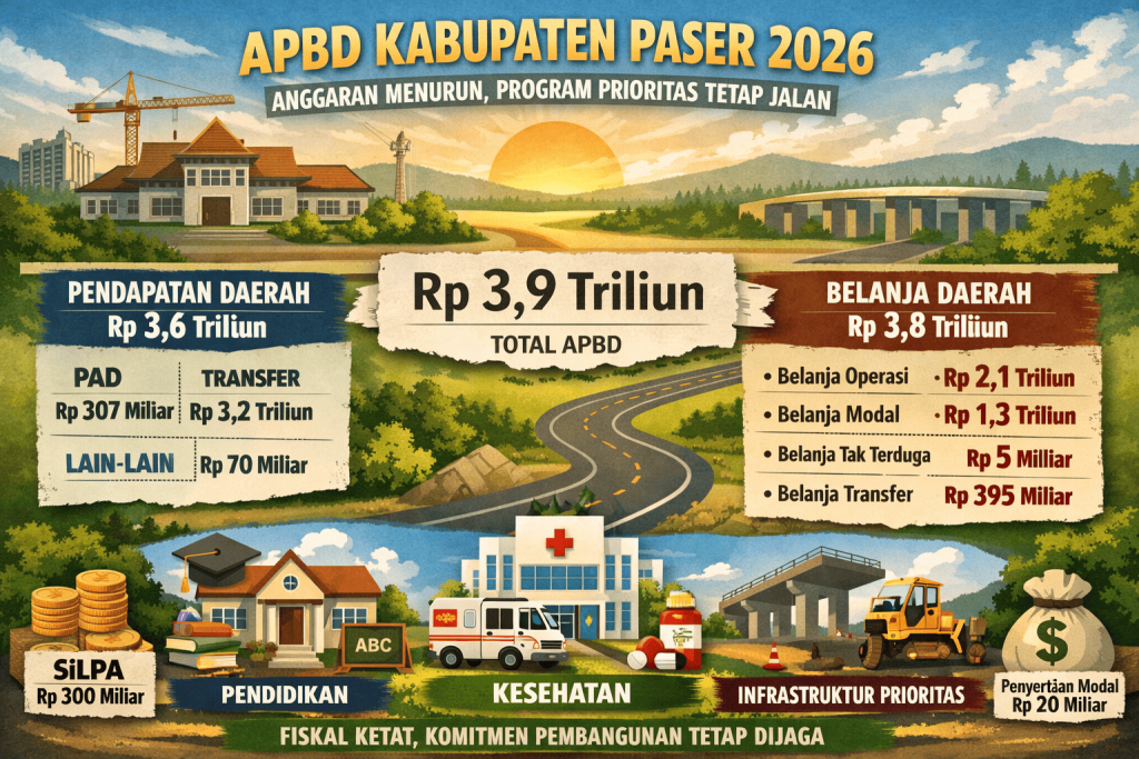 Rancangan Peraturan Daerah (Raperda) APBD Paser 2026 telah disetujui bersama oleh Pemerintah Kabupaten Paser dan DPRD untuk ditetapkan menjadi peraturan daerah. Berdasarkan dokumen tersebut, total APBD 2026 ditetapkan sebesar Rp3,9 triliun.
