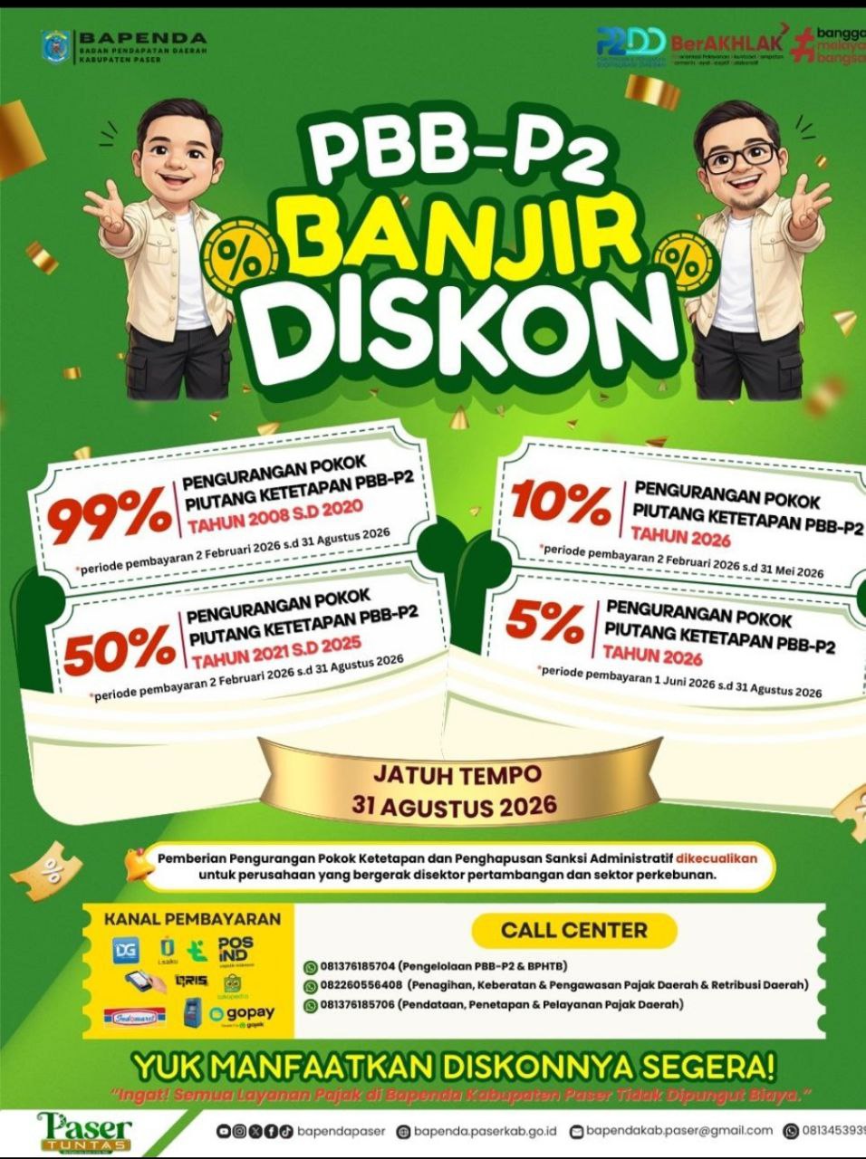 Pembayaran PBB-P2 tahun 2026 yang dilakukan pada periode 2 Februari hingga 31 Mei 2026 memperoleh potongan sebesar 10 persen, sedangkan pembayaran pada periode 1 Juni hingga 31 Agustus 2026 mendapatkan potongan sebesar 5 persen.