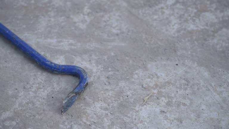 Close panoramic shot from right to left of a blue crowbar on a construction site in Marseille, France