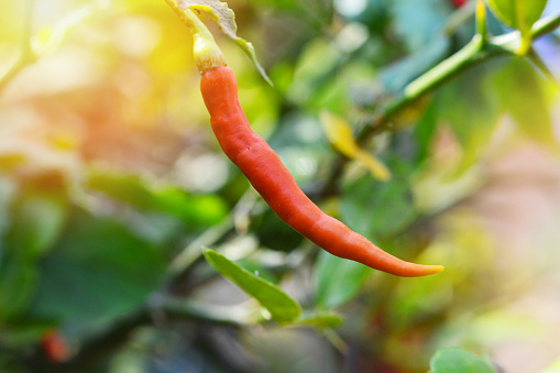 Red chilli pepper in the organic vegetable garden farm green leaf of chilli tree background