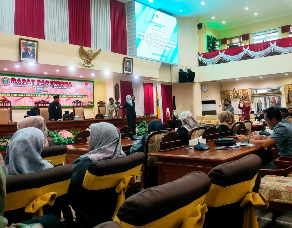 PASER – Dewan Perwakilan Rakyat Daerah (DPRD) Kabupaten Paser menggelar Rapat Paripurna dengan agenda penyampaian pandangan umum fraksi terhadap lima Rancangan Peraturan Daerah (Raperda) usulan Pemerintah Kabupaten Paser. Kegiatan tersebut berlangsung di Ruang Sidang Baling Seleloi, Tana Paser, Kamis (19/02/2026).