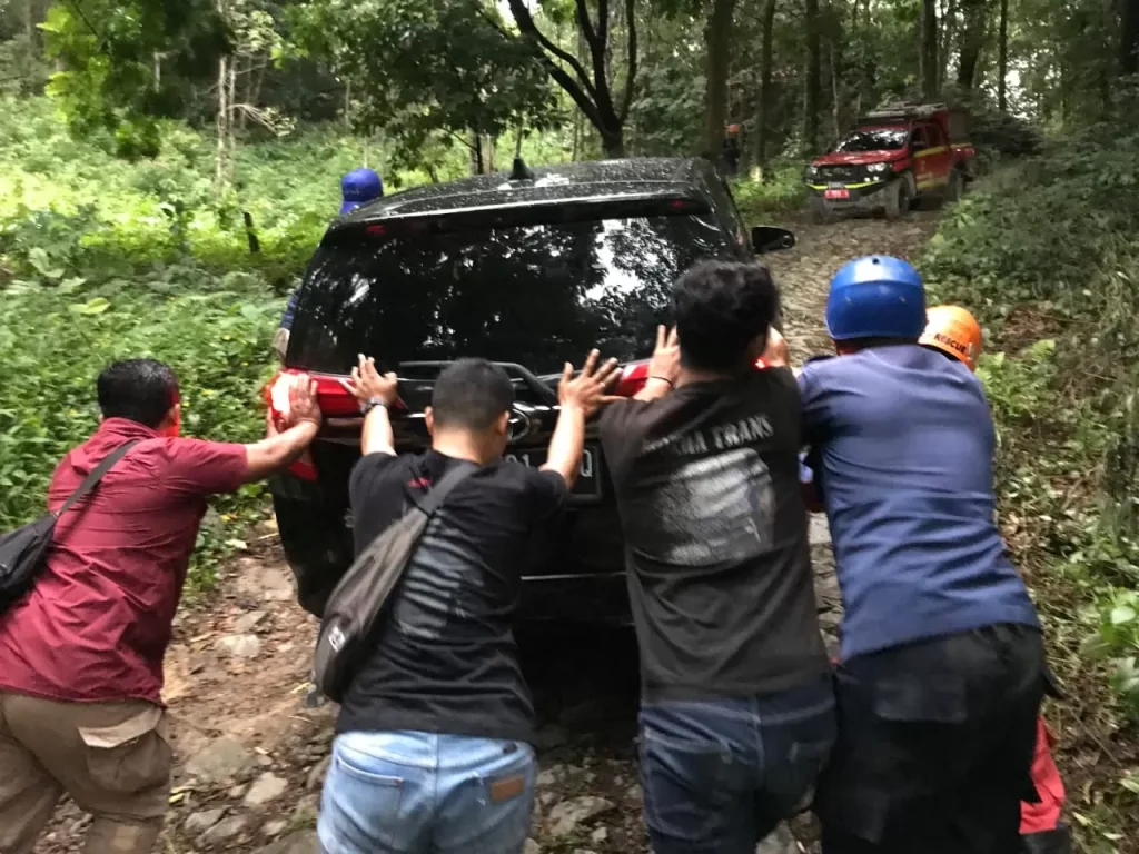 Kesadaran untuk kembali ke arah sebelumnya muncul ketika kondisi medan semakin tidak memungkinkan. Namun, saat kendaraan berusaha putar balik, salah satu mobil tergelincir akibat kontur tanah yang menanjak, basah, dan penuh bebatuan. Meski sudah berusaha mengevakuasi sendiri selama hampir satu setengah jam, situasi tak kunjung membaik.
