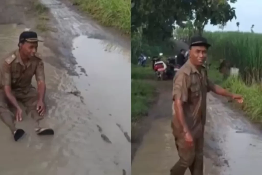 Peristiwa itu terjadi di ruas jalan utama Mlale–Ngepringan, jalur yang kerap dilalui warga untuk beraktivitas sehari-hari. Dalam rekaman video yang beredar luas, Narso terlihat mengenakan seragam dinas lengkap beserta topi. Ia menyiramkan air bercampur lumpur ke tubuhnya di tengah jalan berlubang yang dipenuhi genangan, menggambarkan betapa parah kondisi infrastruktur tersebut.