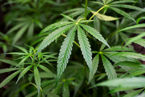 Cannabis. The concept of Indoor grow marijuana. Beautiful leaves of marijuana cannabis plant.