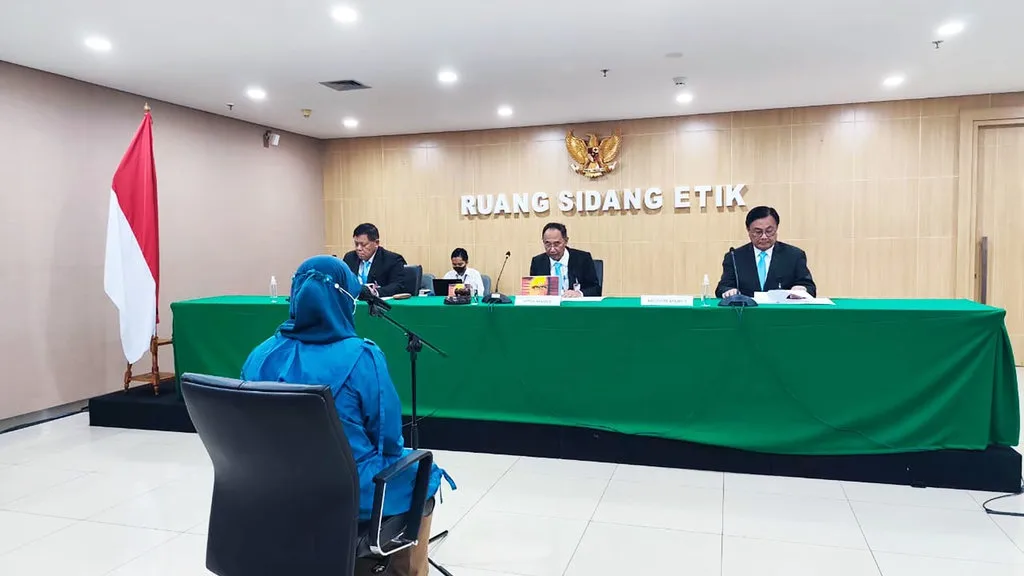 “Menjatuhkan sanksi berat kepada terperiksa tersebut di atas berupa ‘Permintaan maaf secara terbuka langsung, yang disampaikan terperiksa secara tertulis dan dibacakan di hadapan Pimpinan atau Pejabat Pembina Kepegawaian yang rekamannya diunggah pada media dalam jaringan milik Komisi yang hanya dapat diakses oleh insan Komisi (portal) selama 40 hari kerja,” ujar Gusrizal saat memimpin sidang etik.