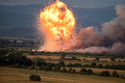This photograph shows an explosion of fireworks factory depot on the outskirts of Sofia on July 25, 2024. At least two people were injured as a fire triggered a series of explosions in fireworks factory depots on the outskirts of Bulgaria's capital Sofia on July 25, 2024 evening, officials said. "Fireworks depots are on fire. We just took out two injured -- a man and a woman, who is more seriously injured," interior ministry's chief of staff Dimitar Kangaldzhiev told public BNT television. (Photo by DIMITAR KYOSEMARLIEV / AFP)