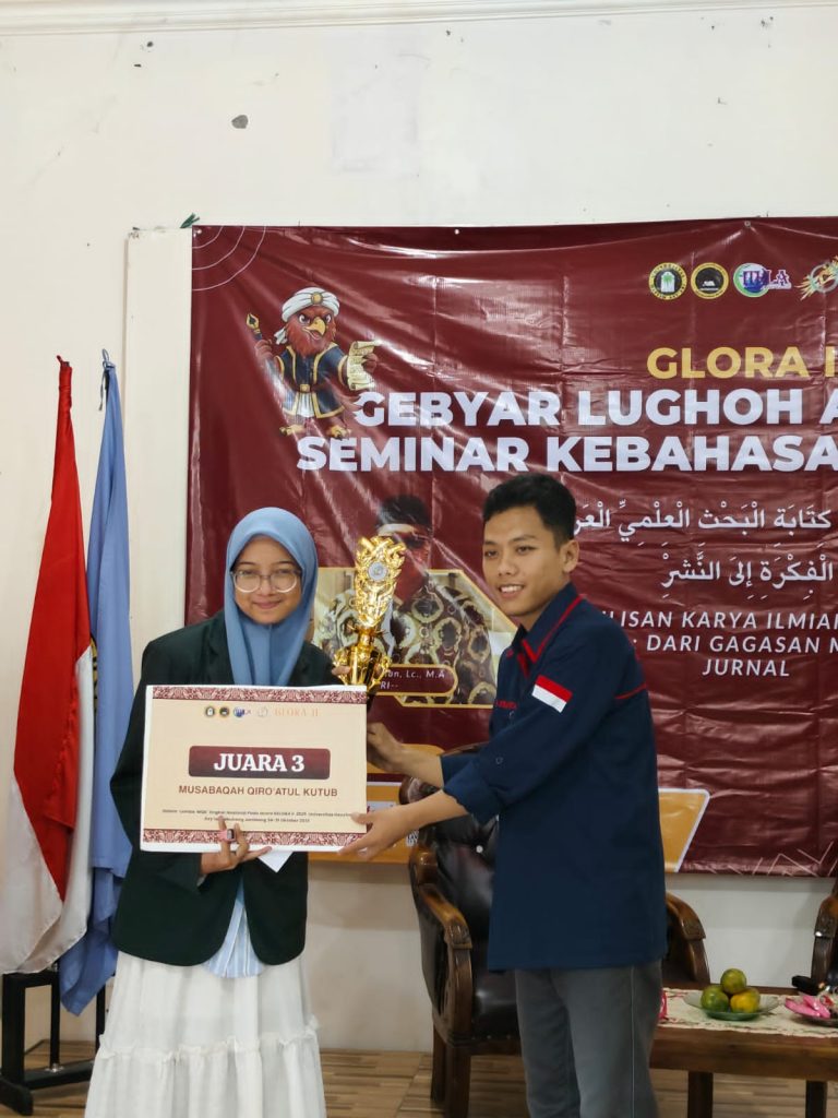 Naimatul Fuadah, mahasantri Pondok Pesantren Darullughah Wal Karomah berhasil meraih juara 3 tingkat nasional dalam ajang Musabaqoh Qiroatul Kutub (MQK) kategori kitab Fathul Qorib.