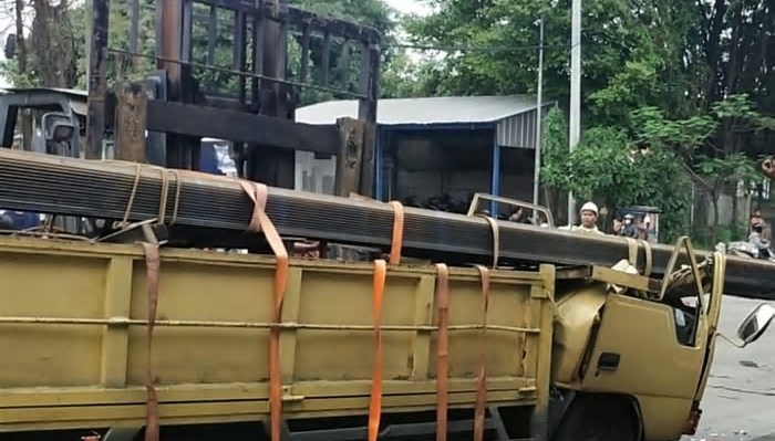 Dari rekaman video yang beredar luas di media sosial dan viral di sejumlah platform, tampak kondisi truk mengalami kerusakan sangat parah. Kabin depan dan kontainer terlihat penyok akibat tertimpa besi yang diangkut. Besarnya muatan yang bergeser ke depan membuat struktur kabin tak mampu menahan tekanan, sehingga kedua korban terjepit di dalam kendaraan.