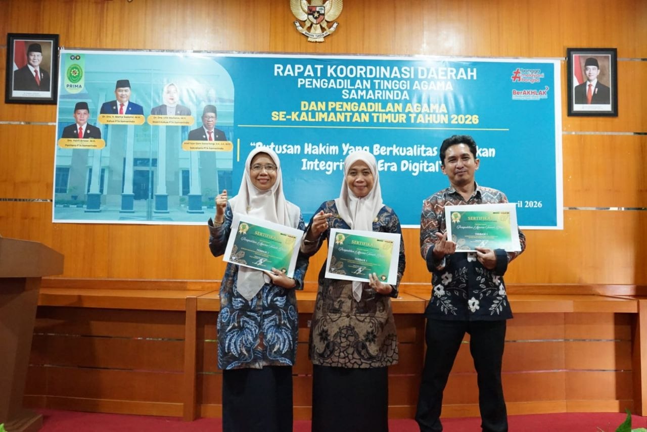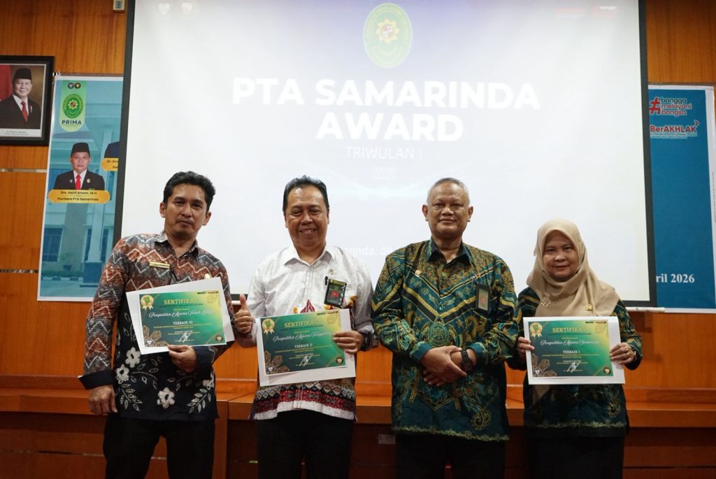 Penghargaan tersebut diberikan oleh PTA Samarinda berdasarkan hasil evaluasi kinerja hingga Triwulan I Tahun 2026, dengan indikator penilaian meliputi pelayanan publik, administrasi perkara, pemanfaatan sistem e-Court, hingga profesionalitas aparatur.