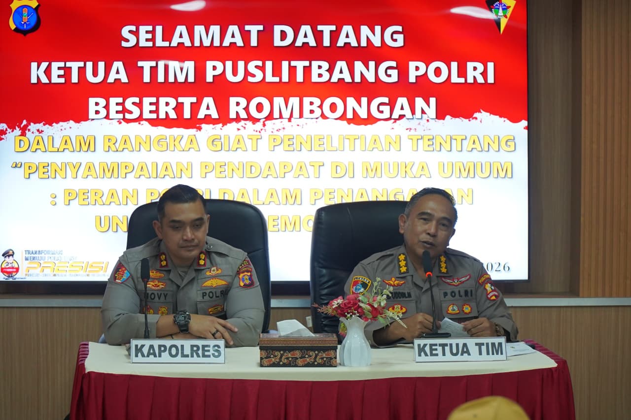 PASER – Kapolres Paser AKBP Novy Adi Wibowo, S.I.K., M.H. menerima kunjungan Tim Pusat Penelitian dan Pengembangan (Puslitbang) Kepolisian Negara Republik Indonesia, Selasa (03/03/2025). Kegiatan tersebut berlangsung di Ruang Rapat Rupatama Mapolres Paser, Jalan Jenderal Sudirman, sebagai bagian dari penelitian terkait penyampaian pendapat di muka umum serta evaluasi penanganan aksi unjuk rasa di wilayah hukum Polres Paser.