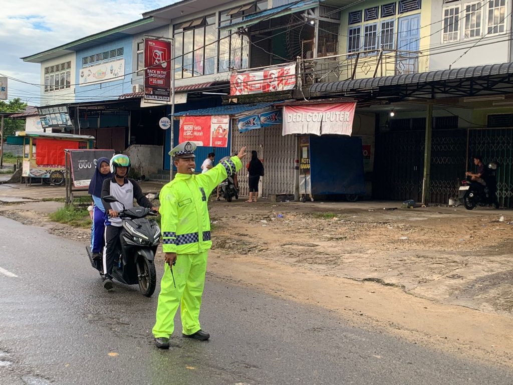 MELAWI, PRUDENSI.COM-Polres Melawi Polda Kalbar – Meski hujan, Pengaturan Lalu Lintas (Gatur Lalin) sebagai bentuk pelayanan tetap di lakukan Satlantas Polres Melawi, Senin (13/10/25)