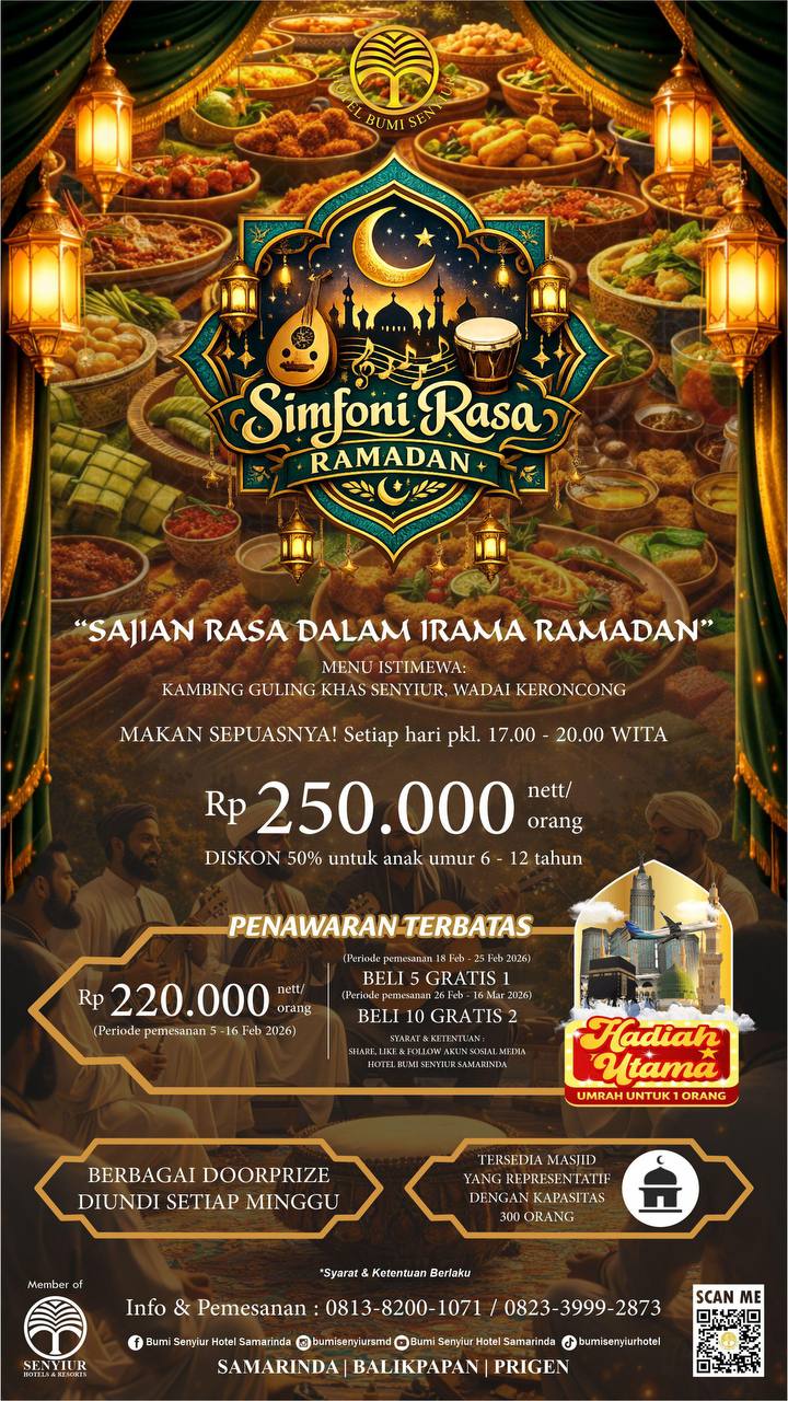 SAMARINDA – Menyambut bulan suci Ramadan 1447 Hijriah, Hotel Bumi Senyiur Samarinda menghadirkan program berbuka puasa bertajuk Simfoni Rasa Ramadan, yang menawarkan puluhan variasi hidangan dan beragam hadiah menarik bagi masyarakat. Program ini sekaligus menjadi ajang silaturahmi dengan rekan media, influencer, dan tamu undangan.
