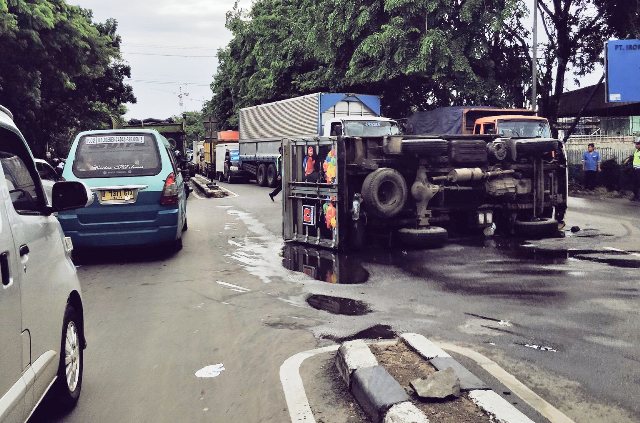 Situasi itu membuat pengemudi truk terkejut. Kondisi kendaraan yang bermuatan berat menyebabkan truk oleng dan akhirnya terguling ke sisi kiri jalan. Posisi truk yang melintang mengakibatkan dua lajur sekaligus tidak dapat digunakan oleh kendaraan lain.